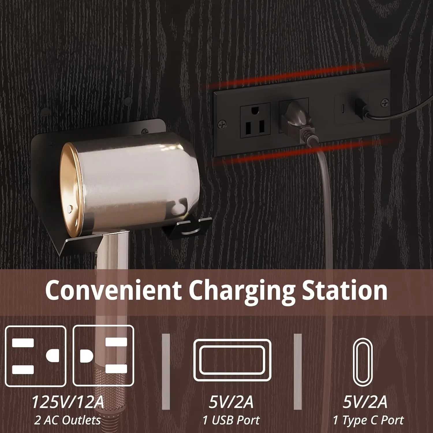 - Built-in power outlet keeps your hair tools and devices within easy reach, eliminating clutter and streamlining your getting-ready process.