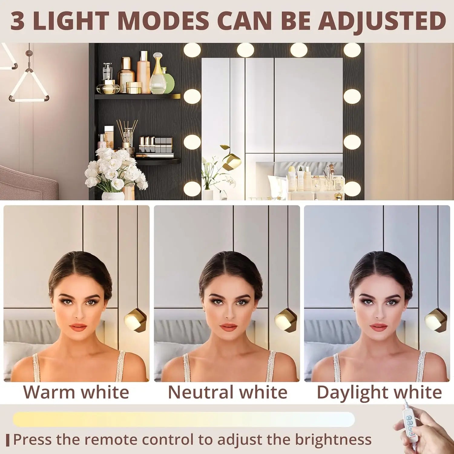 - Three lighting colors let you tailor the glow for makeup, skincare, or evening prep, so you always see your true tones.