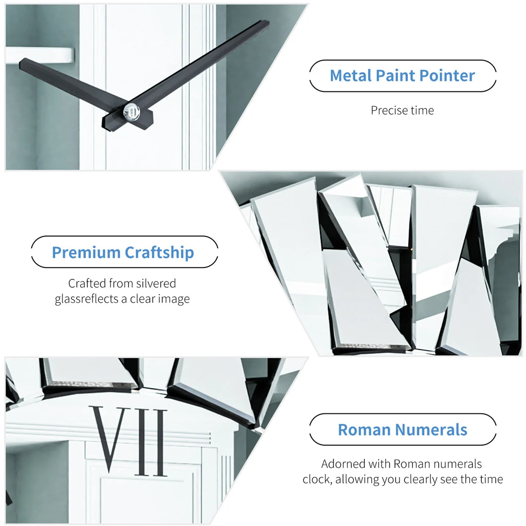 Large Wall Clock with a 3D mirrored sunburst edge and a round, Roman numeral dial delivers a striking centerpiece for any space. Measuring 32 inches (80 cm) in diameter, this modern clock combines luxury mirrors with a clean silhouette to create an eye-catching focal point in living rooms, dining rooms, entryways, and beyond.